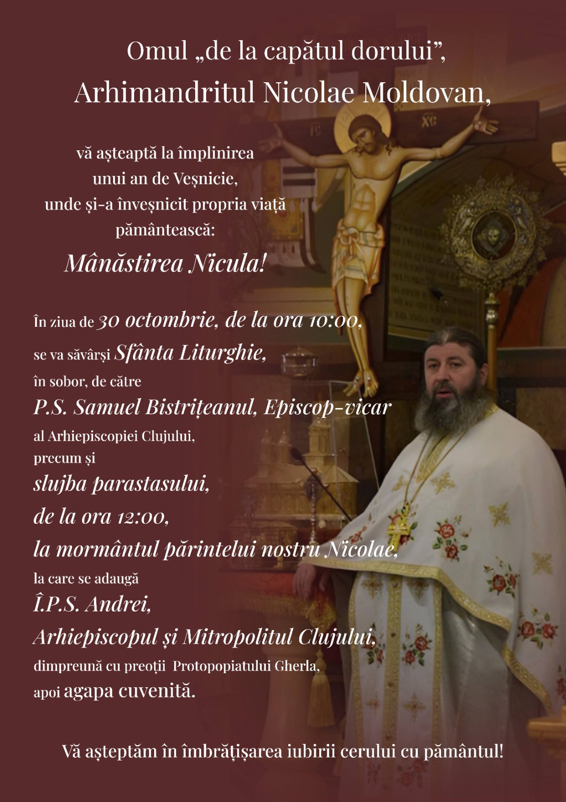 În prezența Înaltpreasfințitului Părinte Mitropolit Andrei, începând cu ora 12:00, se va oficia Slujba Parastasului la un an de zile a Părintelui Arhimandrit Nicolae Moldovan.