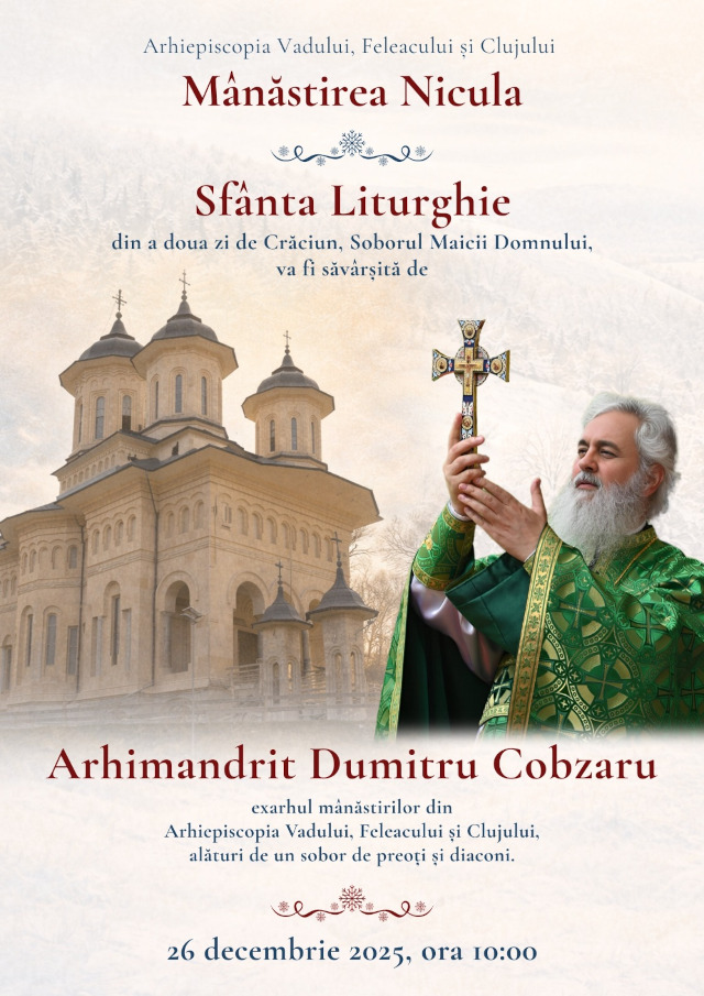 Vineri, 26 decembrie 2025 - Soborul Maicii Domnului, Părintele Arhimandrit Dumitru Cobzaru, exarhul mănăstirilor din Arhiepiscopia Vadului, Feleacului și Clujului, va oficia slujba Sfintei Liturghii și va ține cuvântul de învățătură la Mănăstirea Nicula.